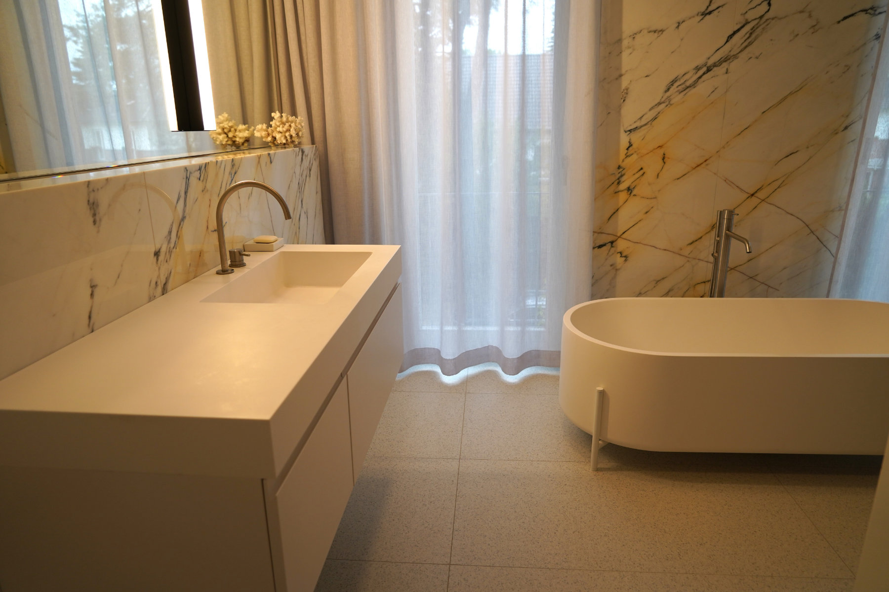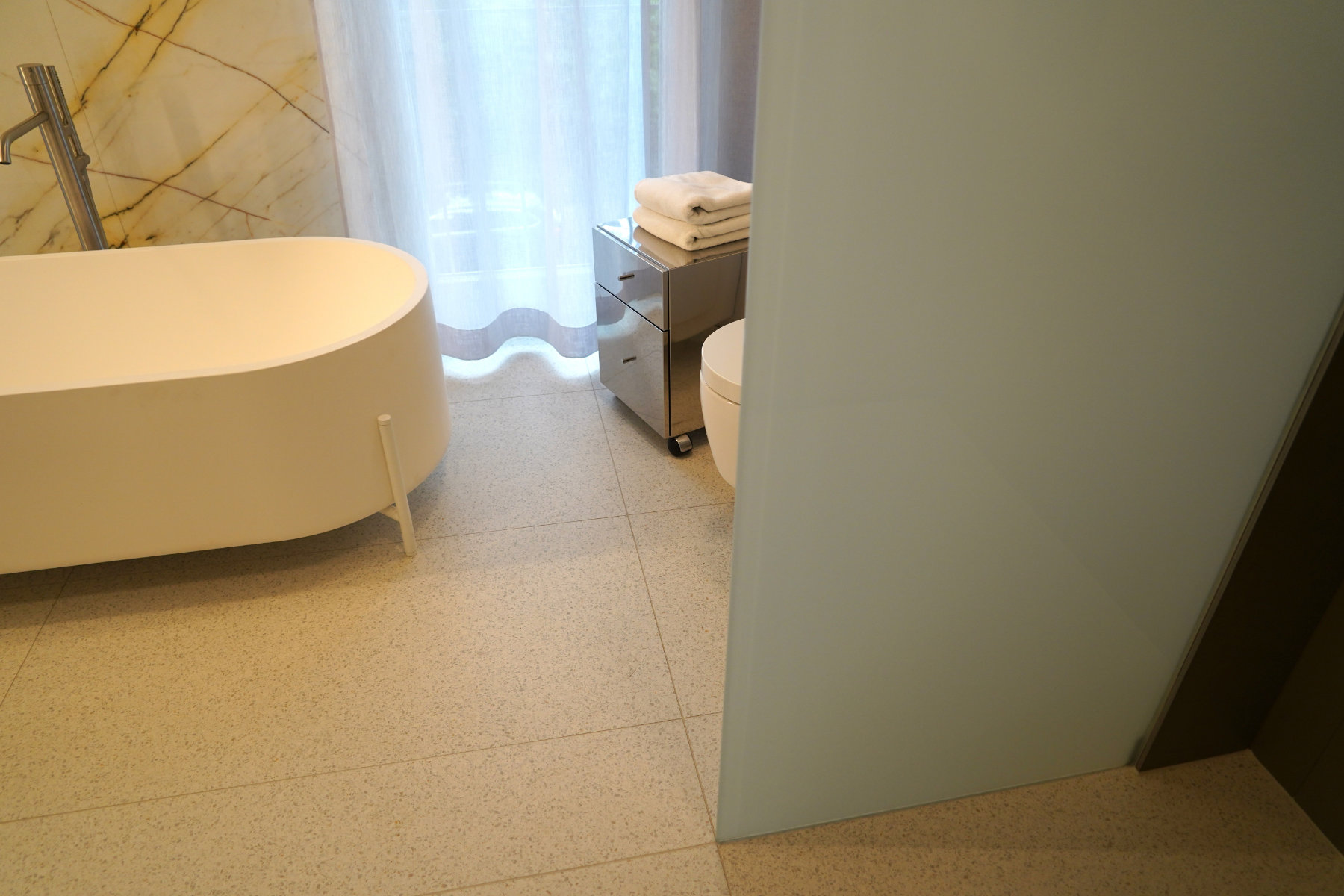 Alle verwendeten Materialien kommen ausschließlich aus Italien: von der Armatur über die freistehende, fast schwebende Wanne, den Wachtisch bis hin zu den Fliesen.