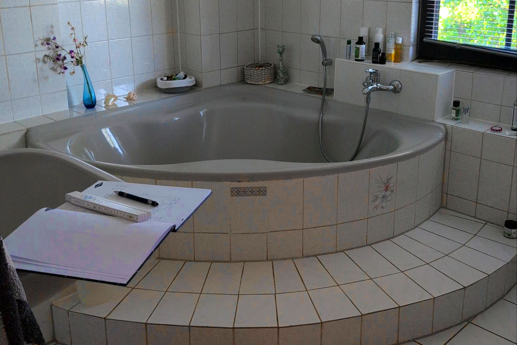 In den 90ern war es schick, raumfressende, runde und mit Stufen begehbare Wannen in dafür viel zu kleinen Räumen zu bauen.