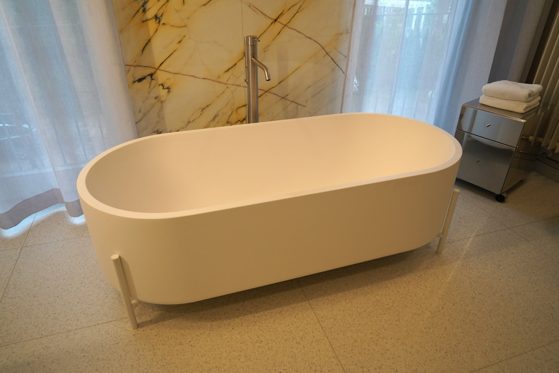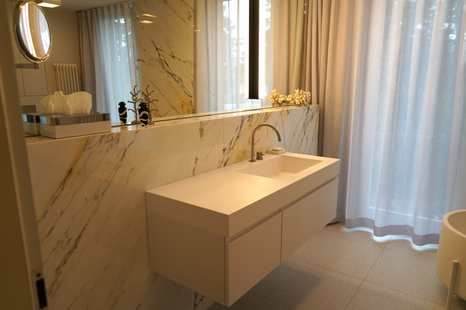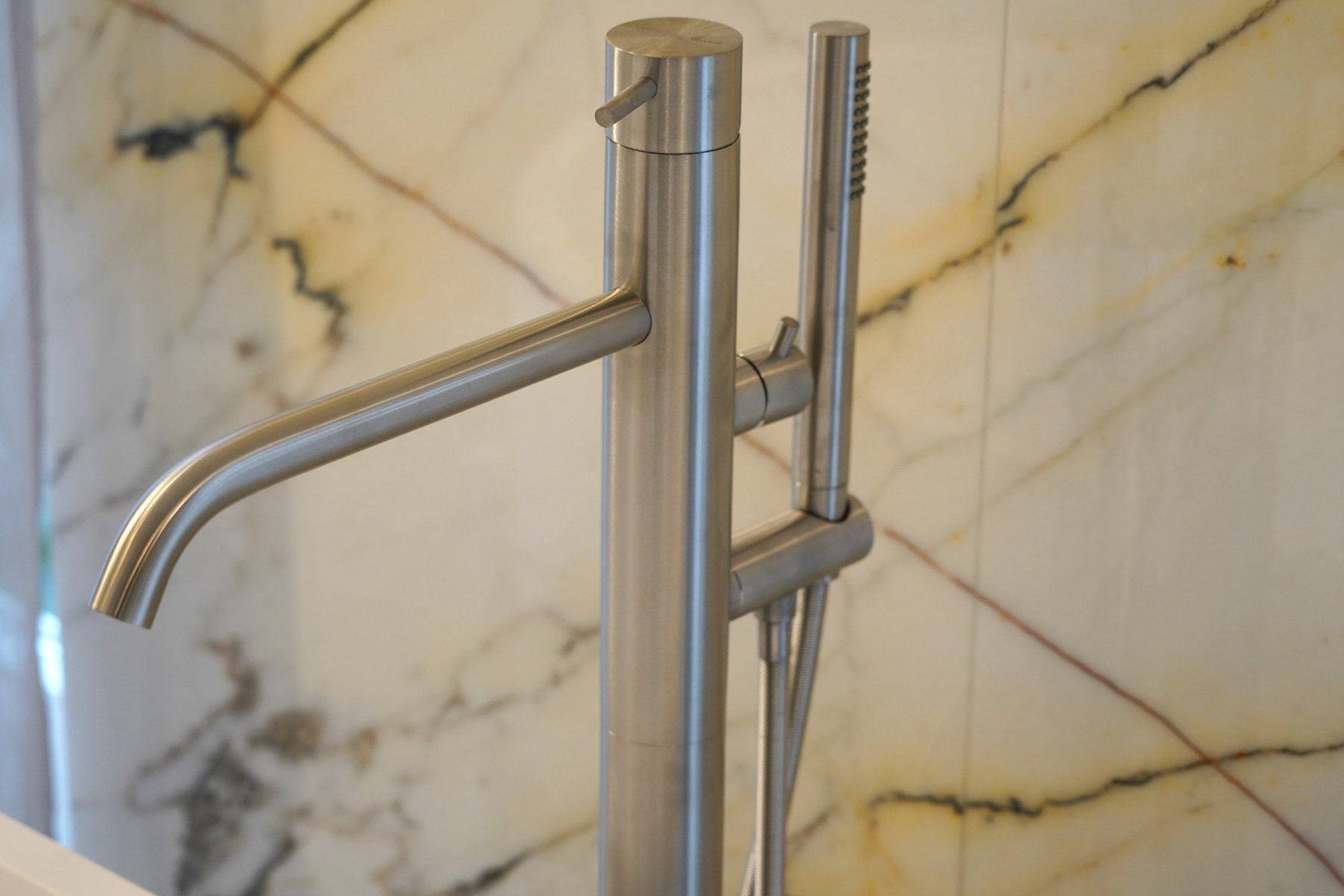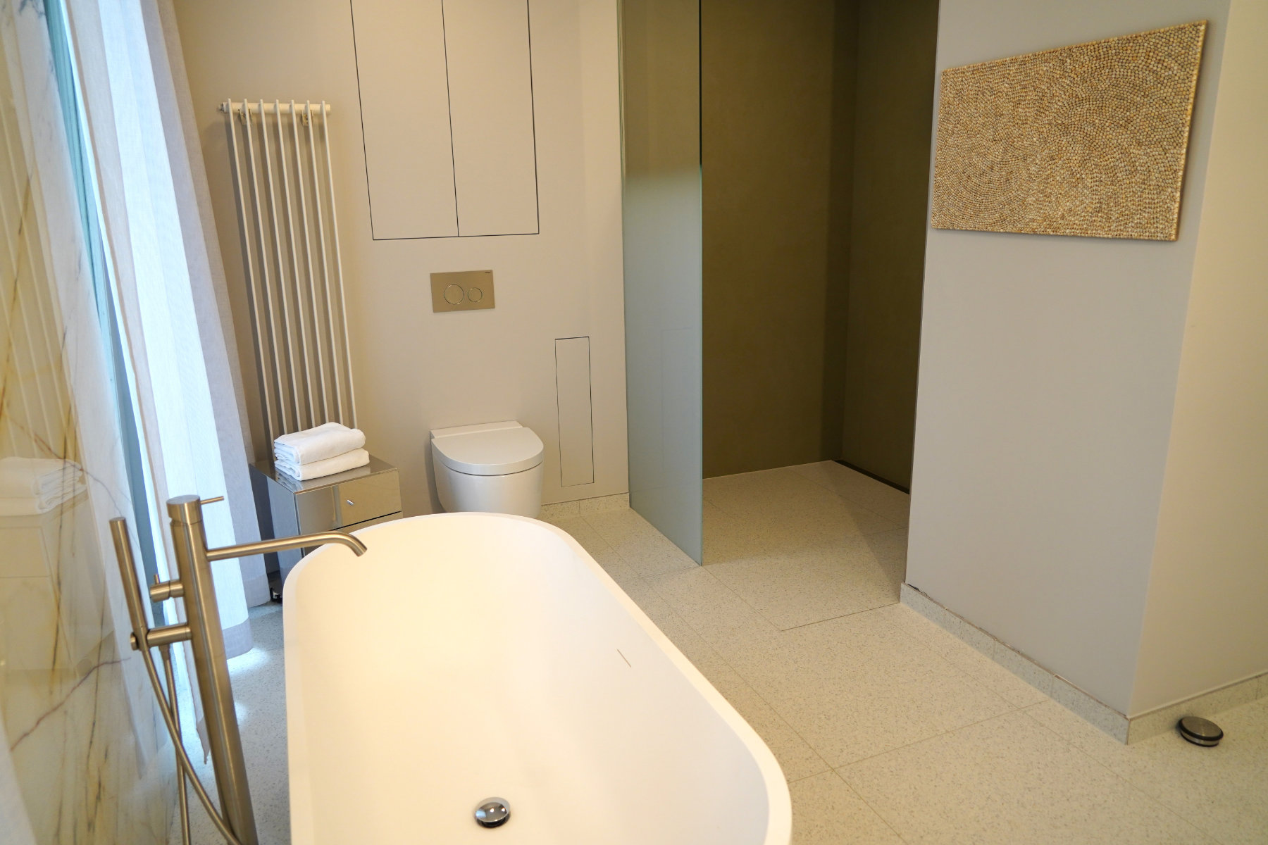 Alle verwendeten Materialien kommen ausschließlich aus Italien: von der Armatur über die freistehende, fast schwebende Wanne, den Wachtisch bis hin zu den Fliesen.