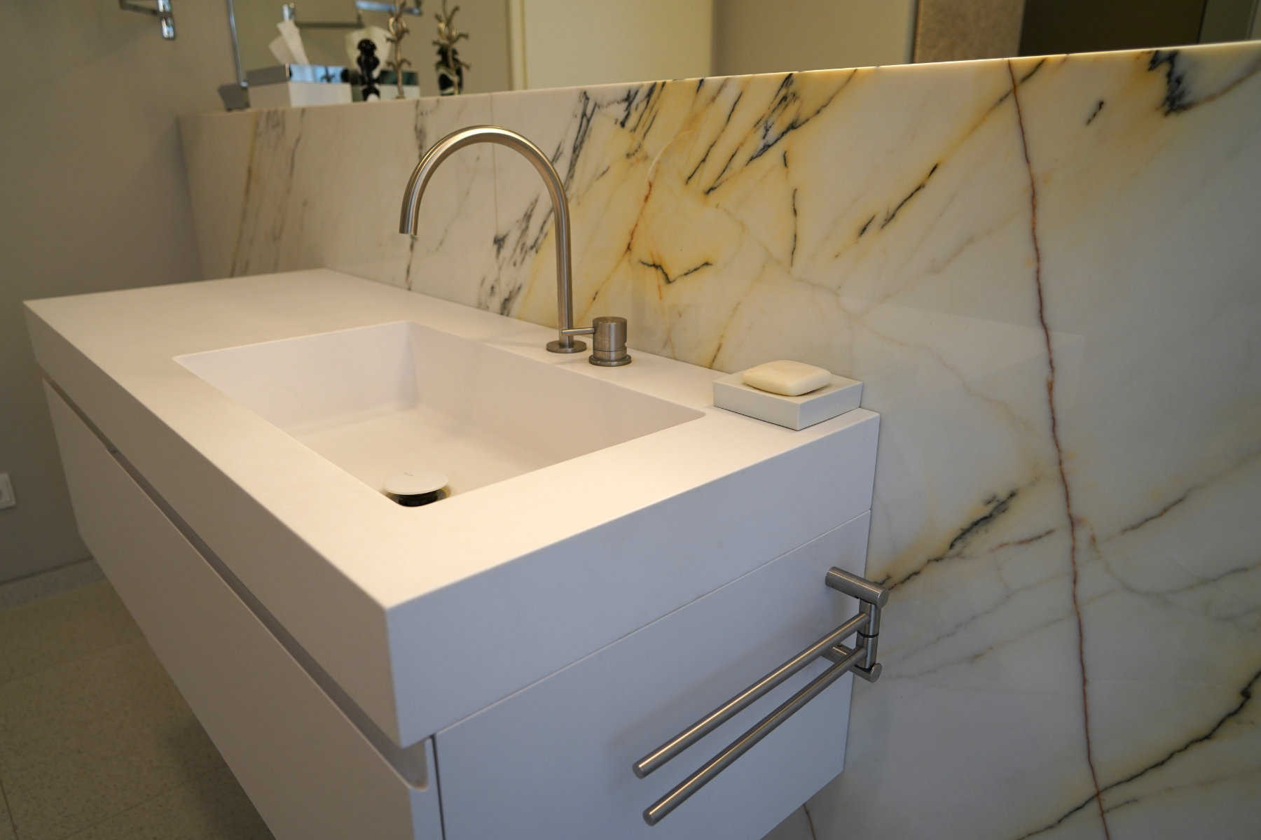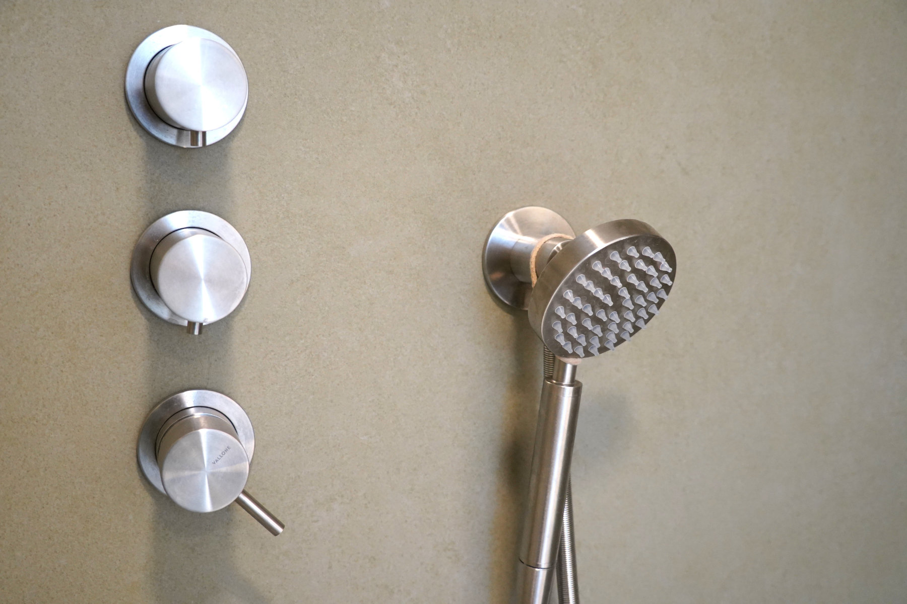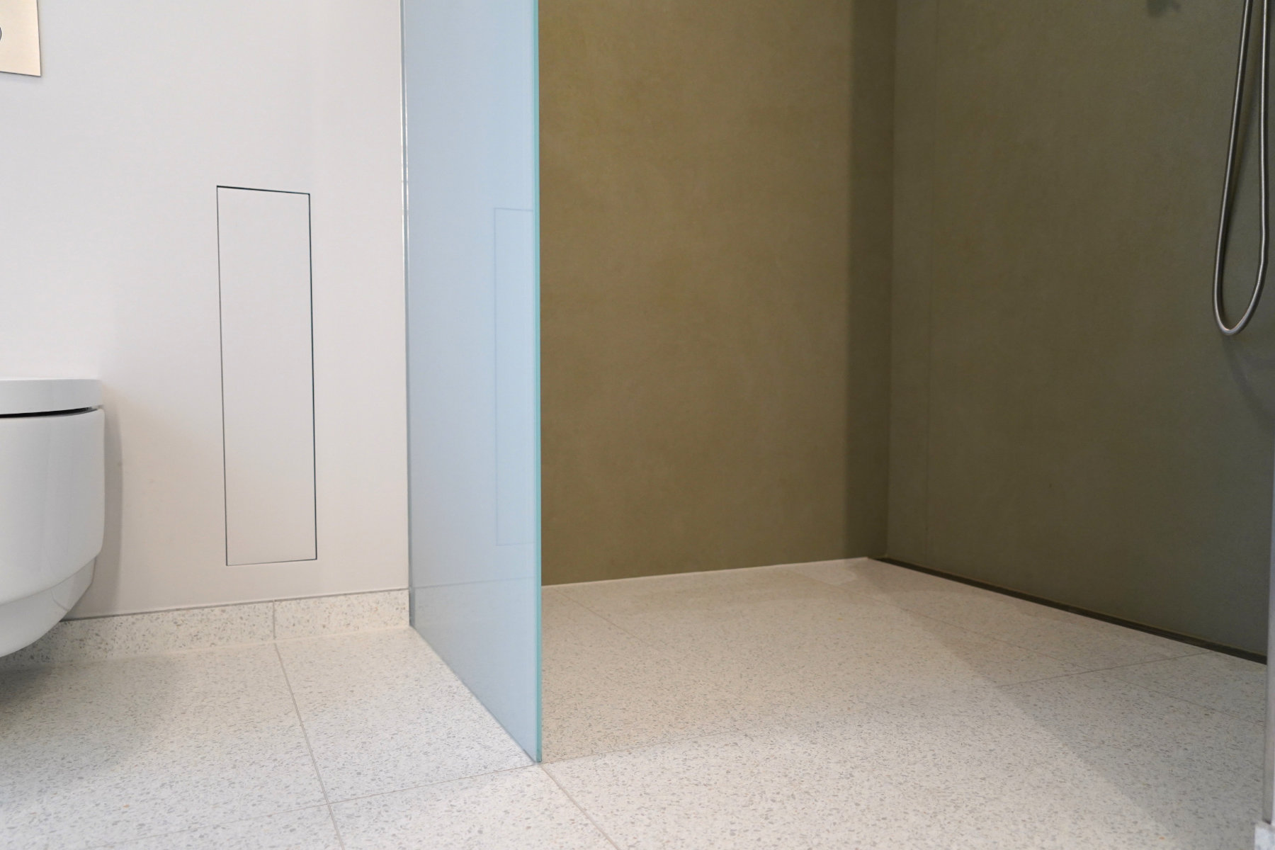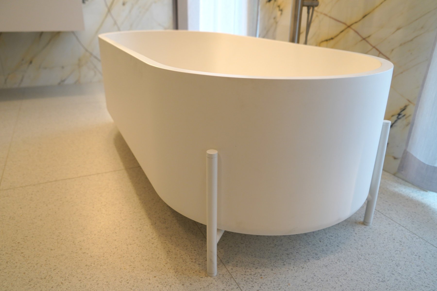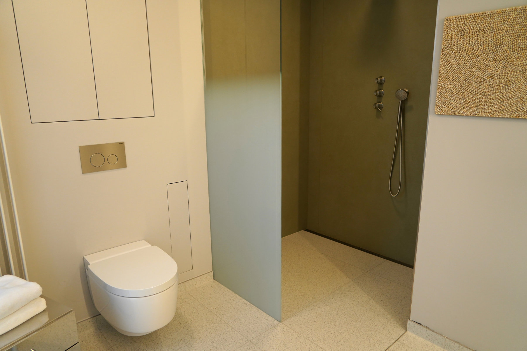 Alle verwendeten Materialien kommen ausschließlich aus Italien: von der Armatur über die freistehende, fast schwebende Wanne, den Wachtisch bis hin zu den Fliesen.